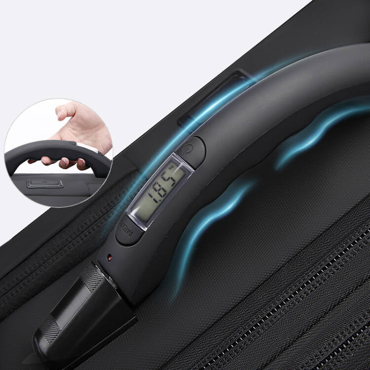 ⚖️ Bilancia Digitale Integrata: Mai più costi extra in aeroporto! La maniglia superiore ergonomica nasconde una bilancia elettronica ad alta precisione. Solleva lo zaino e leggi il peso istantaneamente sul display.