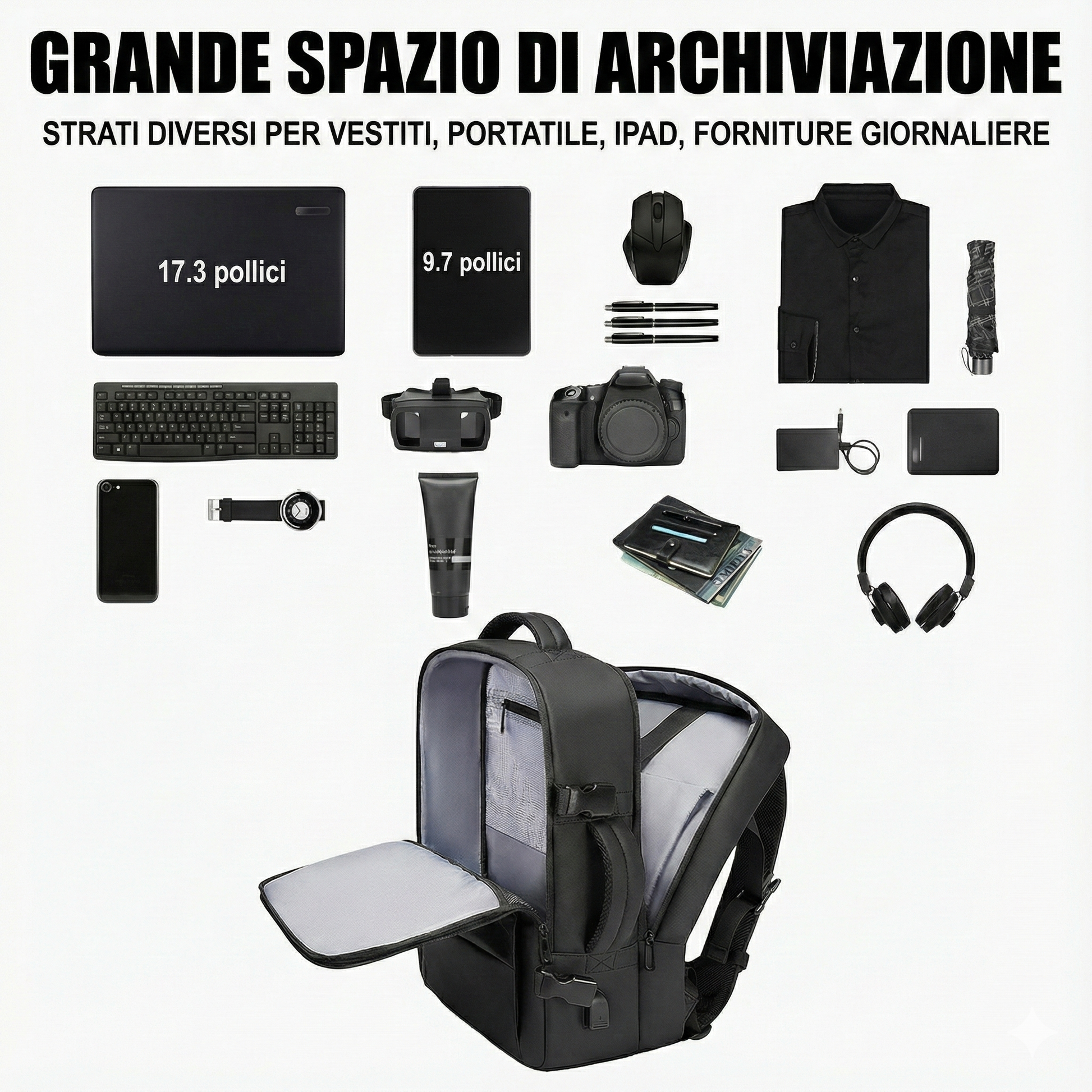 🧳 Organizzazione "Bagaglio a Mano" a 3 Zone: Dimentica il caos. Questo zaino è progettato razionalmente come una valigia, con tre scomparti principali distinti: